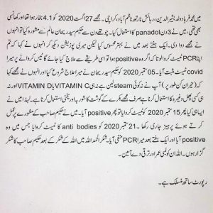 My name is Muhammad Irfan. I am 55 years old. I came back from Dubai to Karachi on 18th March. I am a frequent traveller to Dubai. This time after coming back I got a fever upon which I got myself tested for Corona. My test came out to be positive. The doctors asked me to isolate myself and advised me to take some preventive measures and take steam and recommended consumption of Vitamin C from fruits such as papaya and oranges and they also said that they don’t have any medication for it. After taking steam and eating oranges the condition of my throat worsened. Then one of my friend mentioned and recommended me to consult Hakeem Syed Muhammad Rehan Alam. Upon his recommendation, I talked to Hakeem Syed Muhammad Rehan Alam directly and he advised me after I told him my symptoms and feelings. He asked me to stop intake of any fruits and no need to take Vitamin C because this will further exacerbate my cough and also recommended me to take mutton soup. Then he gave me his medicines and a syrup. After three four days I started to feel much better. The time when I had not taken the medication I was very worried and my condition was worsening day by day but Alhamdulillah after taking the medication I felt much better. I took the medicines for 7 days and after that I got myself tested again and this time I was Corona negative. I informed Hakeem Syed Muhammad Rehan Alam he prescribed me to continue the medication as the medicine course was for two weeks. After 15 days I got tested again and Alhamdulillah it was negative and today I am fine and in good health. Corona virus is not something to be scared of it is a lung disorder Hakeem Syed Muhammad Rehan Alam understood it very well and gave me the medication accordingly and today I am sitting in front of you all healthy and recovered. You should not panic, treatment for corona is available and from my experience I have recovered well and I am here in all health.