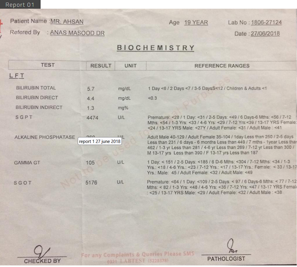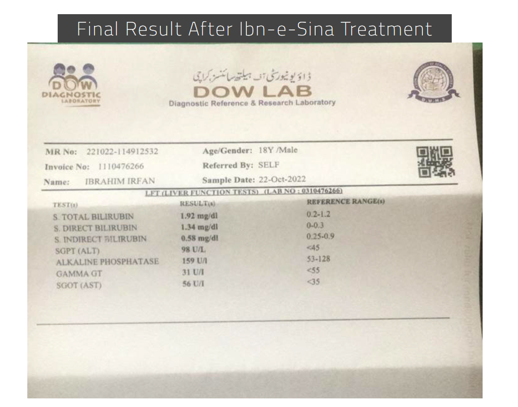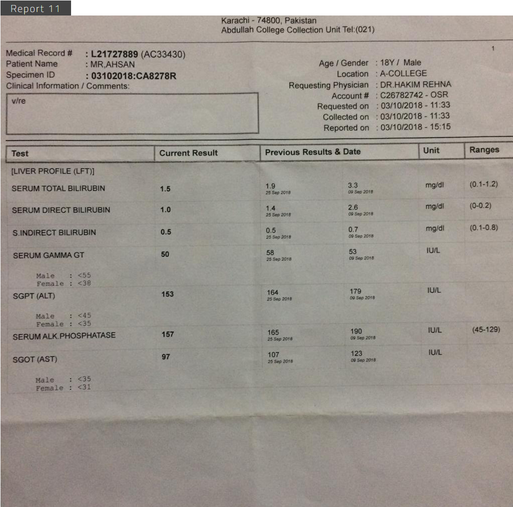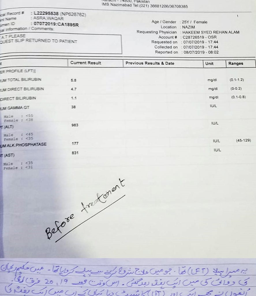 اسلام علیکم میرا نام احسن ہے اور میری عمر 20 سال ہے. 2018 میں مجھے پیلیا ہوا تھا اور 2018-6-27 کو میں نے پہلا ایل ایف ٹی کروایا . اس کے بعد میں نے مختلف ڈاکٹرزس اور حکیموں کا علاج کروایا لیکن فرق نہیں پڑا میرا پیلیاں بگڑ چکا تھا پھر میں نے حکیم ریحان سے علاج کروایا جوکہ میرا علاج ,دوائیاں اور پرہیز ڈھائی مہینے تک چلا اور الحمدللہ میں ٹھیک ہوگیا پھر ٹھیک ہونے کے ایک سال بعد حکیم ریحان کے مشورے پر میں نے ایل ایف ٹی ٹیسٹ کروایا اور الحمدللہ وہ ٹیسٹ بلکل ٹھیک آیا جو یہ ہے