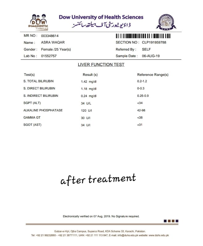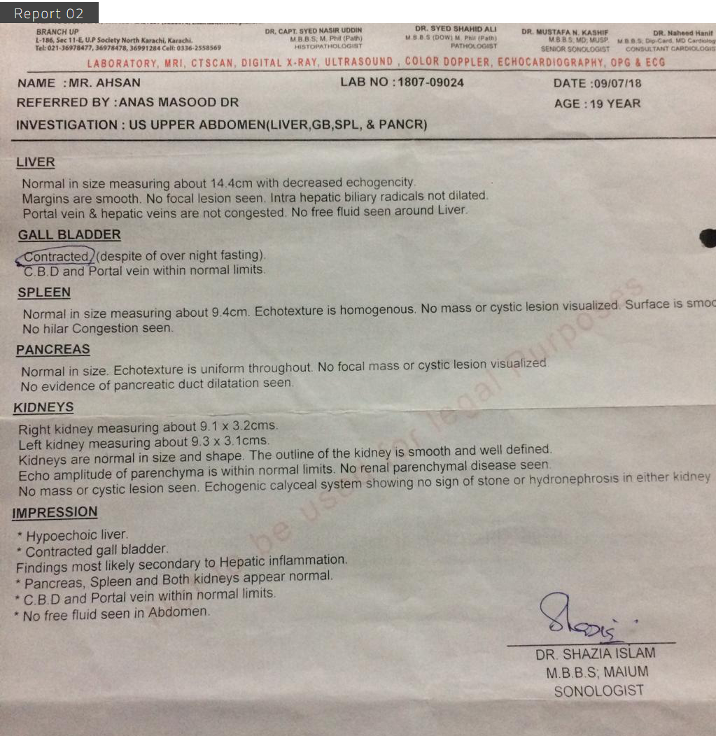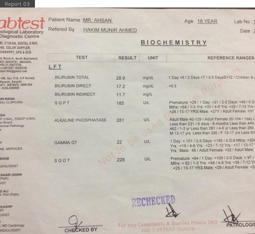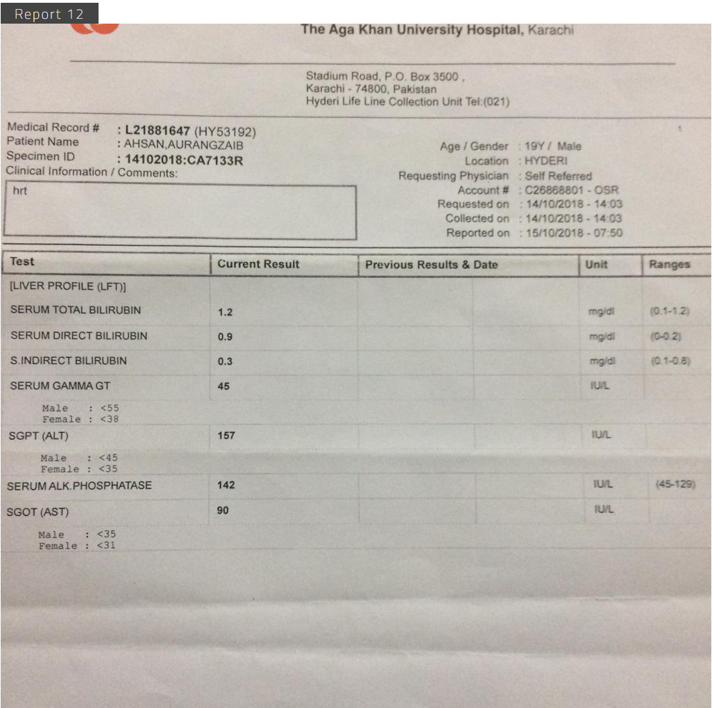 اسلام علیکم میرا نام احسن ہے اور میری عمر 20 سال ہے. 2018 میں مجھے پیلیا ہوا تھا اور 2018-6-27 کو میں نے پہلا ایل ایف ٹی کروایا . اس کے بعد میں نے مختلف ڈاکٹرزس اور حکیموں کا علاج کروایا لیکن فرق نہیں پڑا میرا پیلیاں بگڑ چکا تھا پھر میں نے حکیم ریحان سے علاج کروایا جوکہ میرا علاج ,دوائیاں اور پرہیز ڈھائی مہینے تک چلا اور الحمدللہ میں ٹھیک ہوگیا پھر ٹھیک ہونے کے ایک سال بعد حکیم ریحان کے مشورے پر میں نے ایل ایف ٹی ٹیسٹ کروایا اور الحمدللہ وہ ٹیسٹ بلکل ٹھیک آیا جو یہ ہے