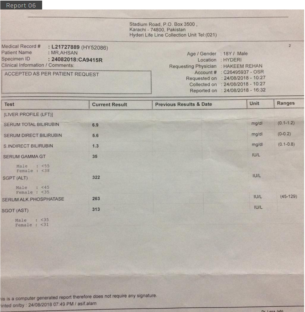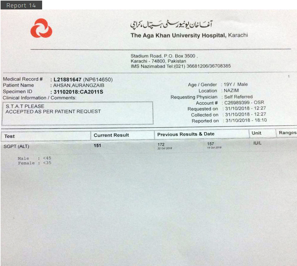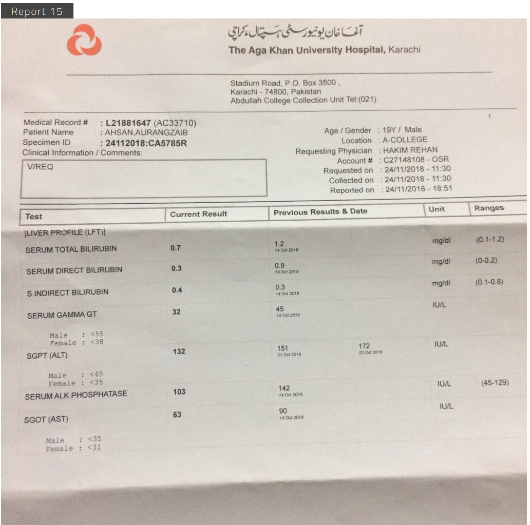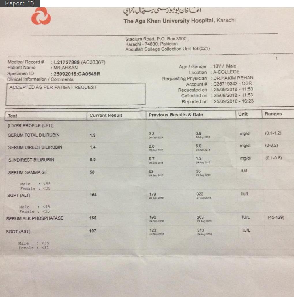 Lately my elder son, Ibrahim Irfan who is 18 years of age, suddenly started showing symptoms of severe back ache, fever, vomits and lack of appetite. Within 4 days the situation got worse. Alhmdulillah being linked with this way of cure, Hakeem Rehan, through the morning urine sample, specified that it seemed to him that his Liver was affected. He advised us for Liver Enzymes tests for our reassurance and I must say that the reports were quite disturbing. See Picture 1. They were bad enough to rush him to the hospital and anyone could make out that his condition, physically was not good. He had signs of severe Jaundice.