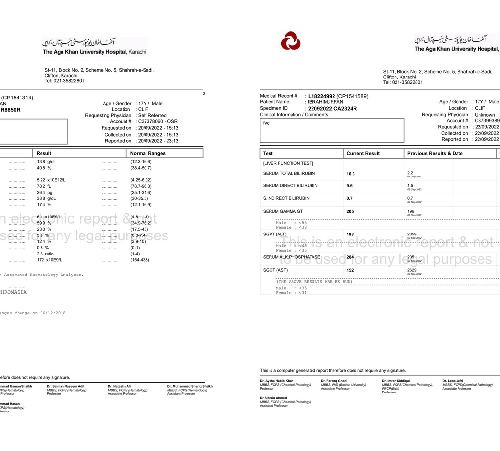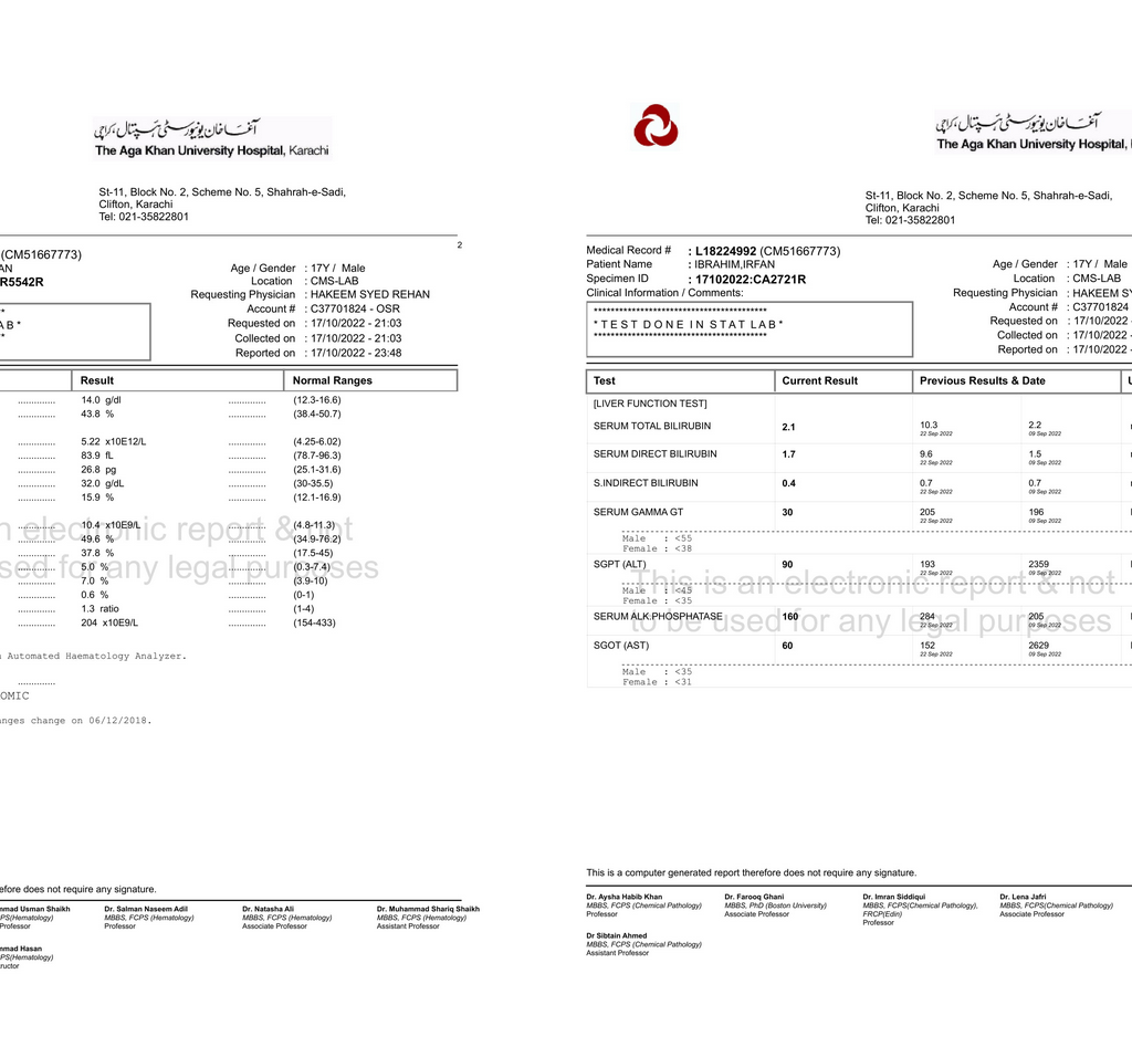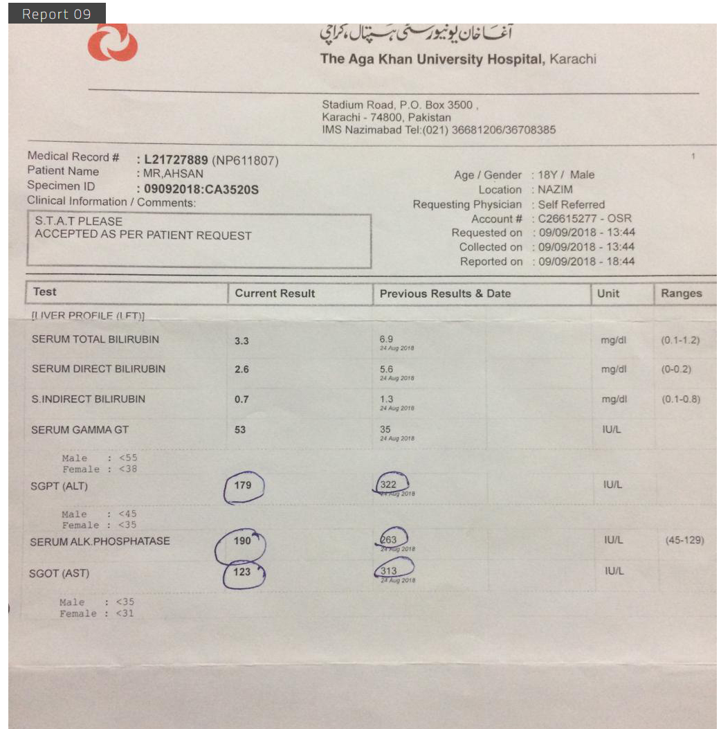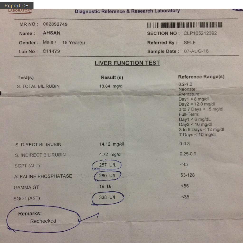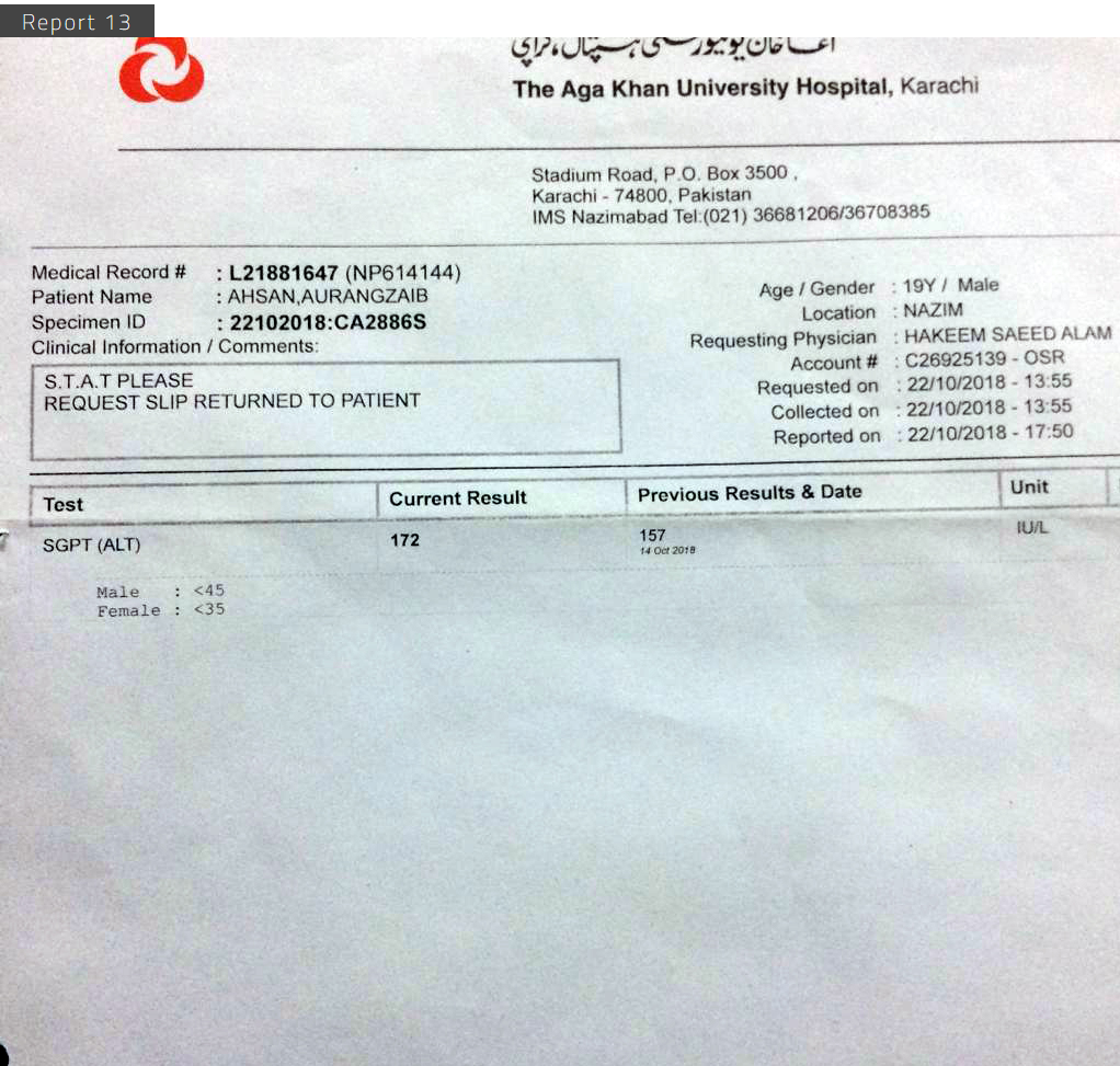 Lately my elder son, Ibrahim Irfan who is 18 years of age, suddenly started showing symptoms of severe back ache, fever, vomits and lack of appetite. Within 4 days the situation got worse. Alhmdulillah being linked with this way of cure, Hakeem Rehan, through the morning urine sample, specified that it seemed to him that his Liver was affected. He advised us for Liver Enzymes tests for our reassurance and I must say that the reports were quite disturbing. See Picture 1. They were bad enough to rush him to the hospital and anyone could make out that his condition, physically was not good. He had signs of severe Jaundice.