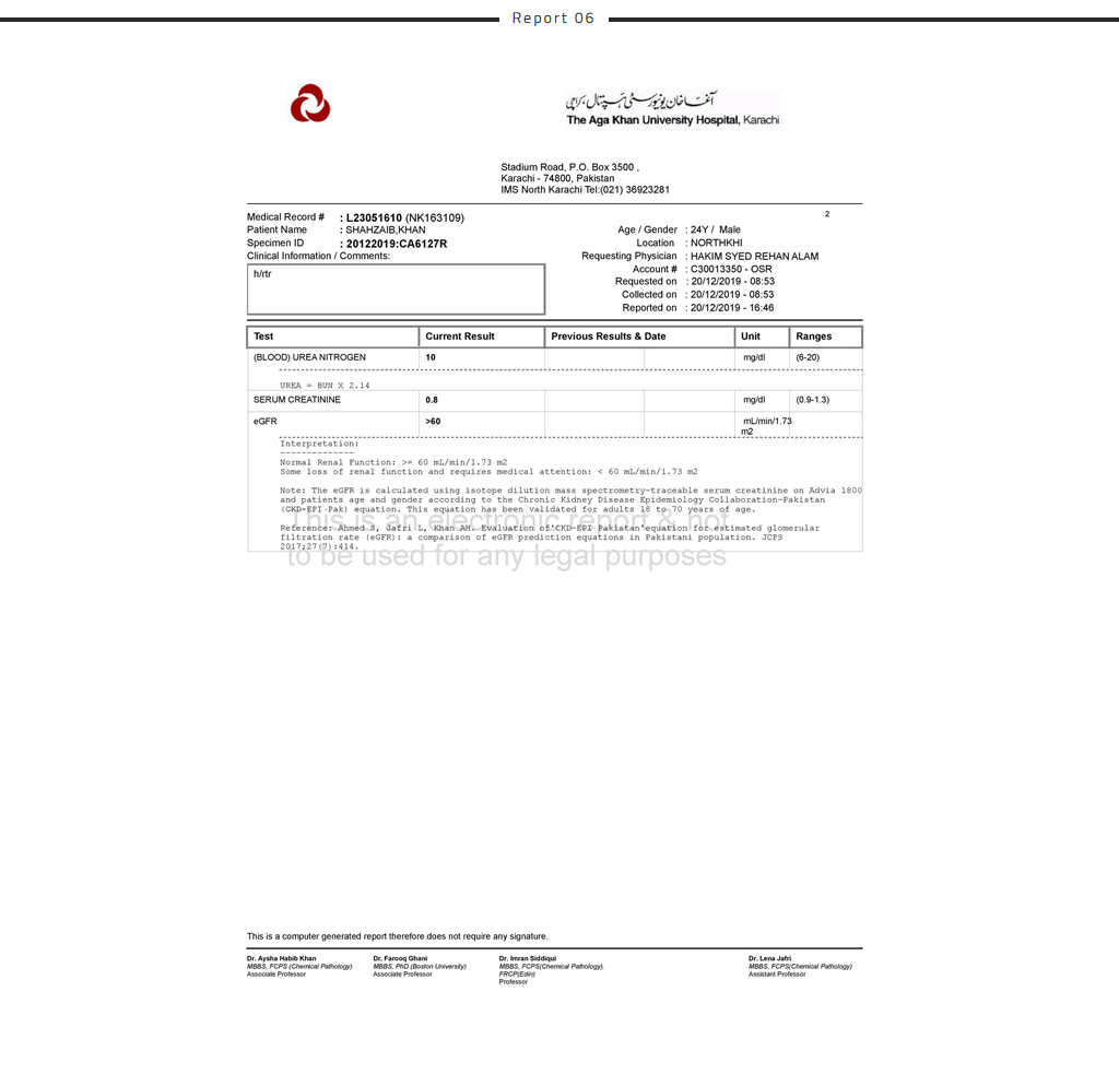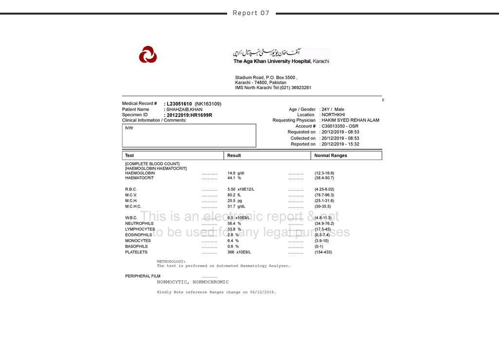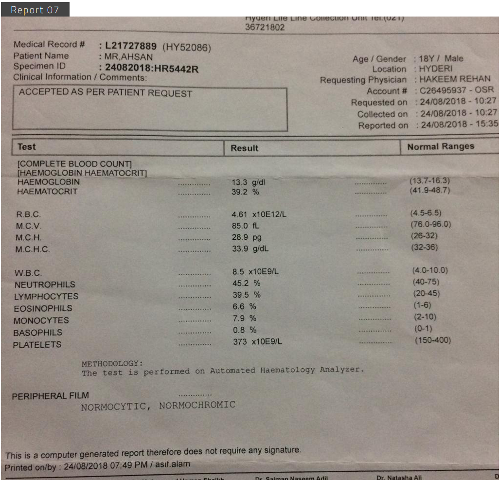When Next Day I contacted my doctor, he said you have Infection in your kidney, I would inject drip and you would be Ok, But It didn’t help me, however report was showing High Increase of protein in Urine, Which is clearly a symptom of kidney was not functioning well, However I was in continuous pain, and my family was also worried about me, Thereafter my Father in Law told me to visit Hakeem Rehan Alam and he claimed that he also had Kidney problem which was cured by Hakeem Sb. Finding no other way I visited at Hakeem Rehan sb. He checked my Urine sample and reports, and asked me other reports from Aga Khan and DOW Lab for knowing the seriousness of matter, I got report result after four days which are as Follows. After getting report, I asked my parents to go to Hakeem sb to ask if this is serious problem , however I have informed by DOW Hospital that situation is too serious, I need to get admitted into Hospital for Dialysis in priority basis, After watching report, Hakeem sb was also concern, As report was showing that my creatinine level is so high and also have high protein in Urine, which is clearly a symptoms of Kidney failure, When my parents come to know that they were more concerned about the issue, However Hakeem sb said them for Ultrasound before start of treatment, If ultrasound would Show that my kidney has not contracted yet , he would Start my treatment otherwise he would recommend me to SIUT, Alhamdullilah I got Ultrasound which shows that Kidney has not contracted yet so Hakeem sb started my treatment, He said I would try my best, But It’s only Allah who can cure diseases, But you have to follow my advice. You have to eat what I would say, and you should not eat what I stop you to eat, after that He gave me one week of medicine and said me to visit after a week with Urine sample, After a week he checked me, and give one more week medicine and said me after finishing that repeat those tests again to check improvement, He add CBC Test to know further about my health, and When after a week I did those test, the result was shocking.