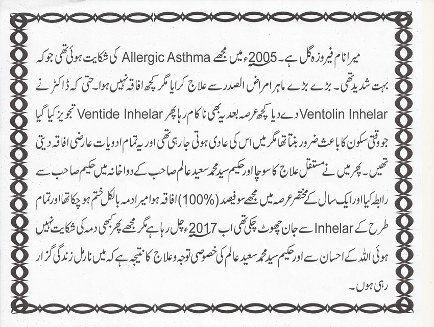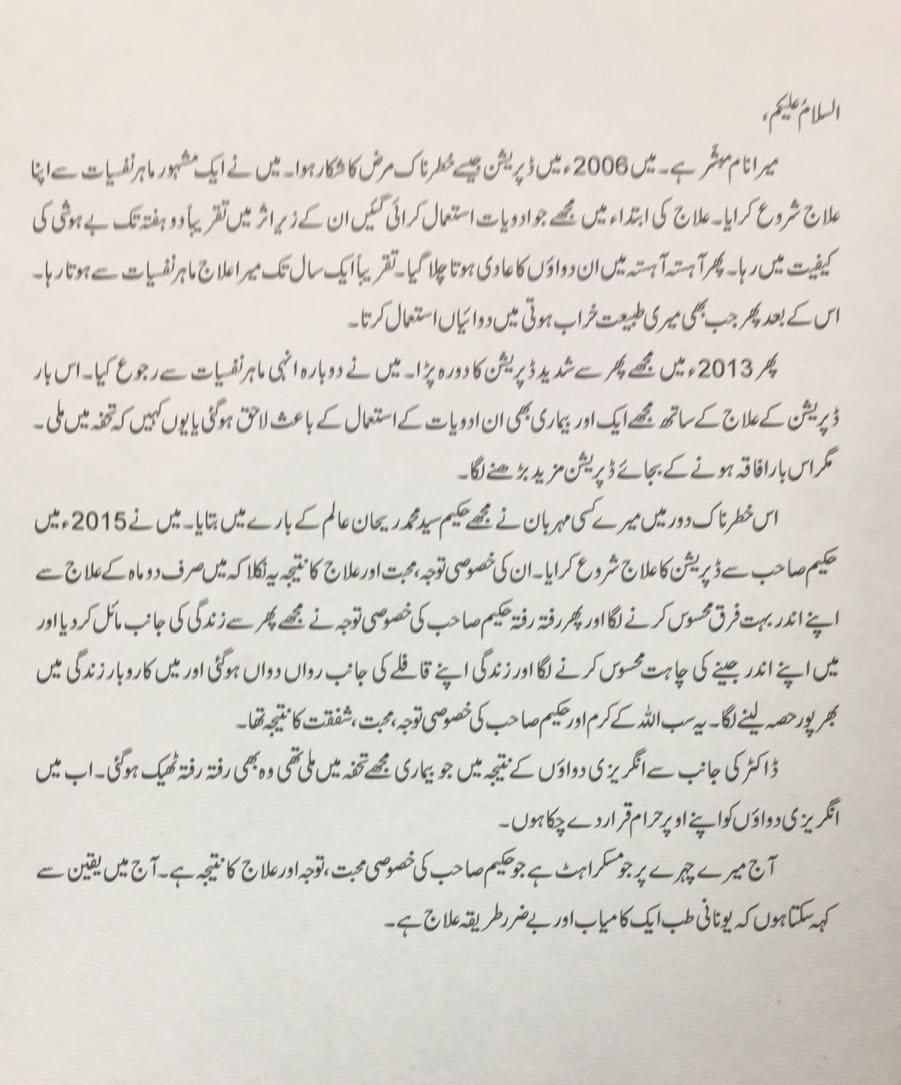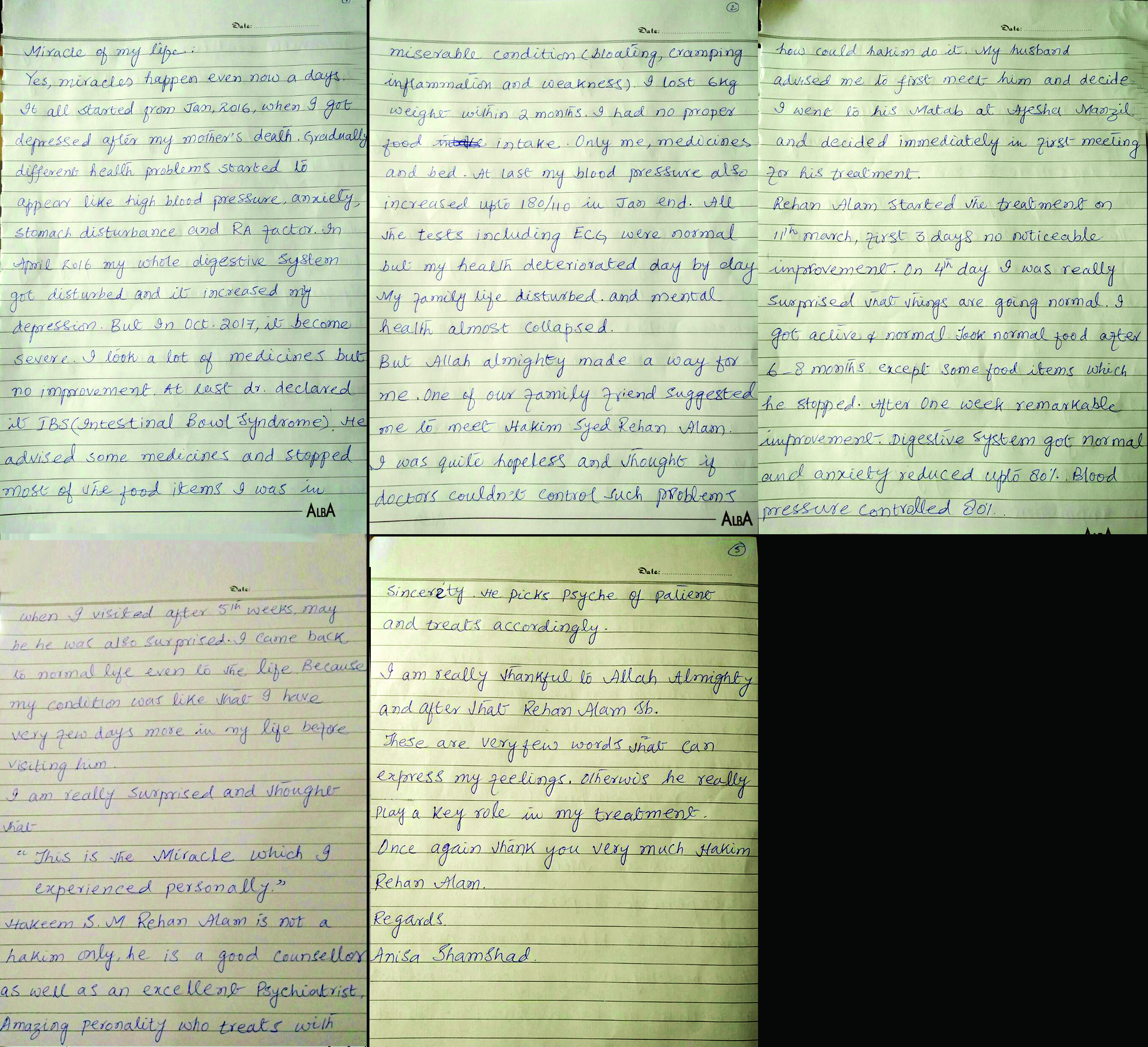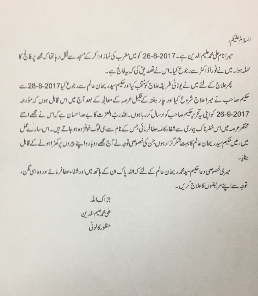 Today, by the grace and blessing of Allah (SWT), and the support, special care, and attention of my tabib, Hakeem Syed Muhammad Rehan Alam, Alhamdolillah! Summa Alhamdolillah! I am perfectly alright. No one can look at me today and say that I had suffered such an extreme paralysis attack. [During my illness] My memory had gotten wiped out temporarily, and I didn’t know what was happening, I was delirious. Alhamdolillah! I am alright today. I am grateful to Allah (SWT) and to my tabib who worked hard to heal me, giving me the right medicine at the right time.