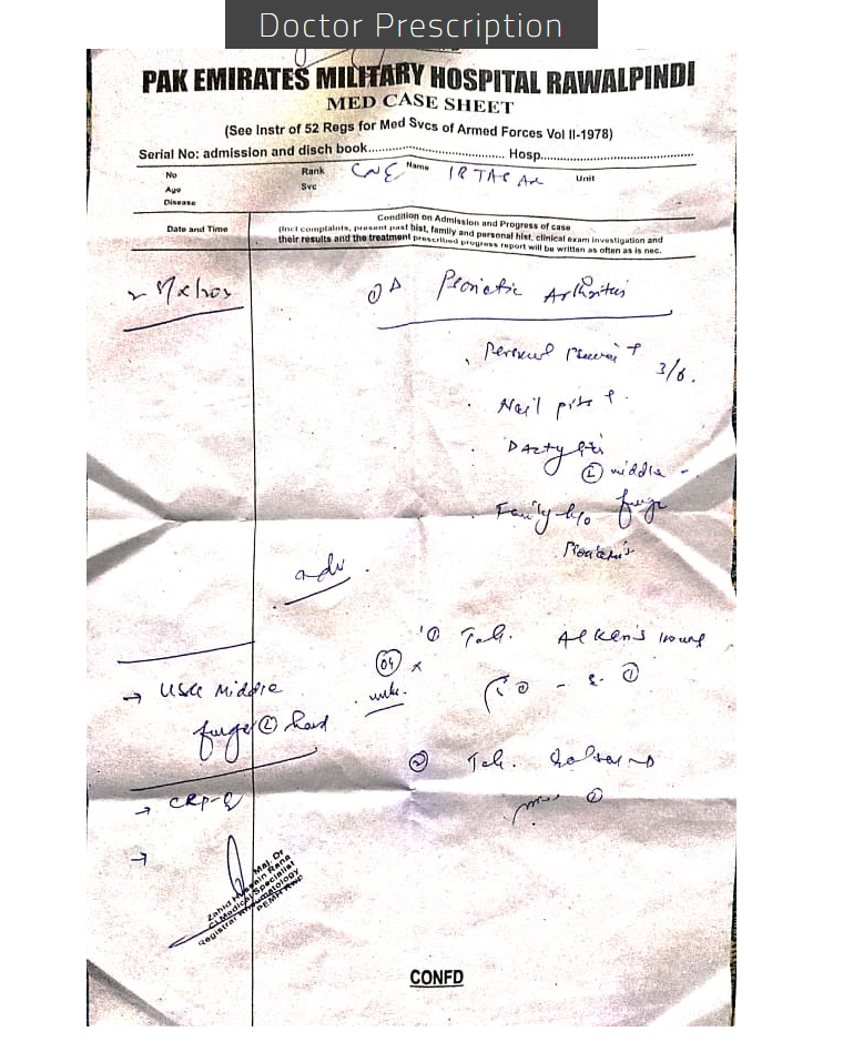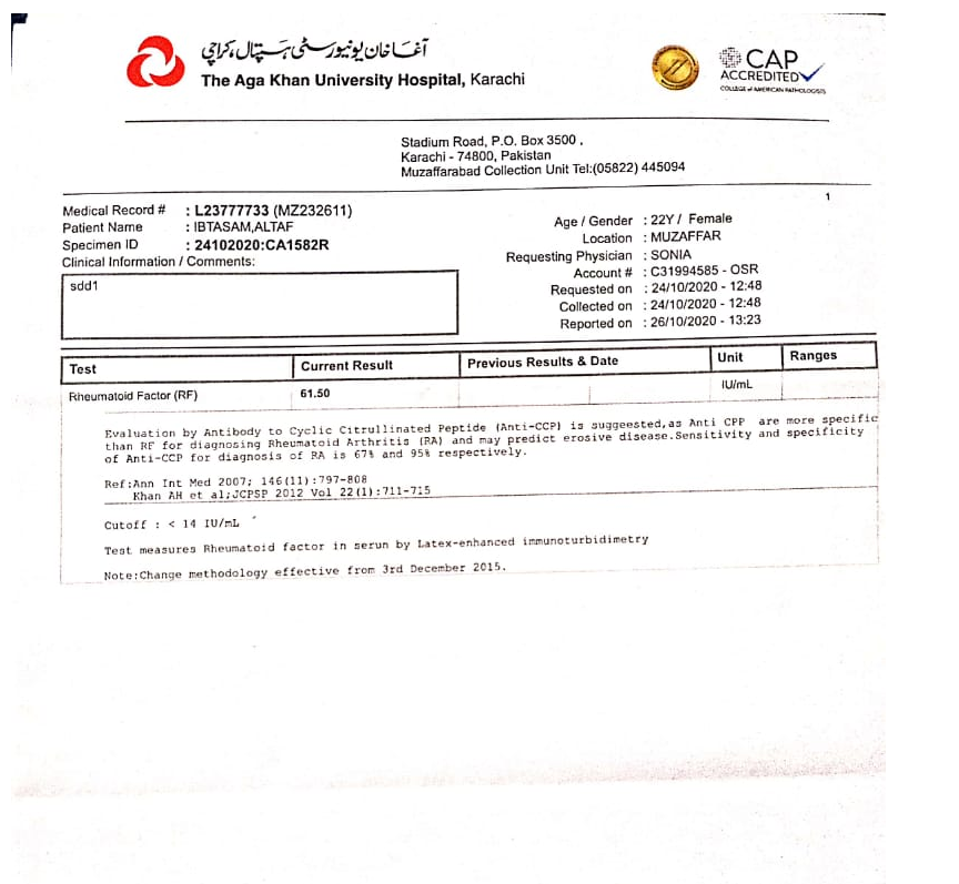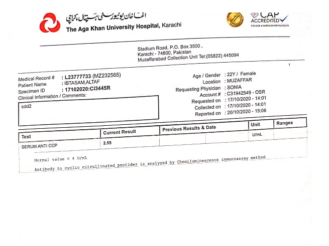 میں نے علاج کی غرض سے CMH Mzd کا رخ کیا، انھوں نے RA اور anti ccp tests کرواۓ۰