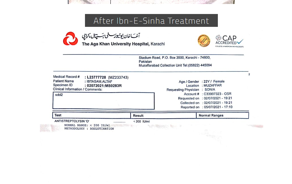 پھر 2021 میں کسی خیرخواہ کے توسط سے میری حکیم ریحان صاحب (دوا خانہ ابنِ سینا، کراچی) سے بات ہوئی۰ میں نے واٹس ایپ پر انکو اپنی علامات اور اب تک کے معالجے کی تمام تفصیل بیان کی، انھوں نے چند مزید ٹیسٹس بتاۓ۰ پھر جولائی 2021 میں باقاعدہ علاج شروع کیا۰حکیم صاحب نے مجھے 6 ماہ کی دوا اور پرہیز بتائی ، نومبر میں دوا روک دی گئی۰
