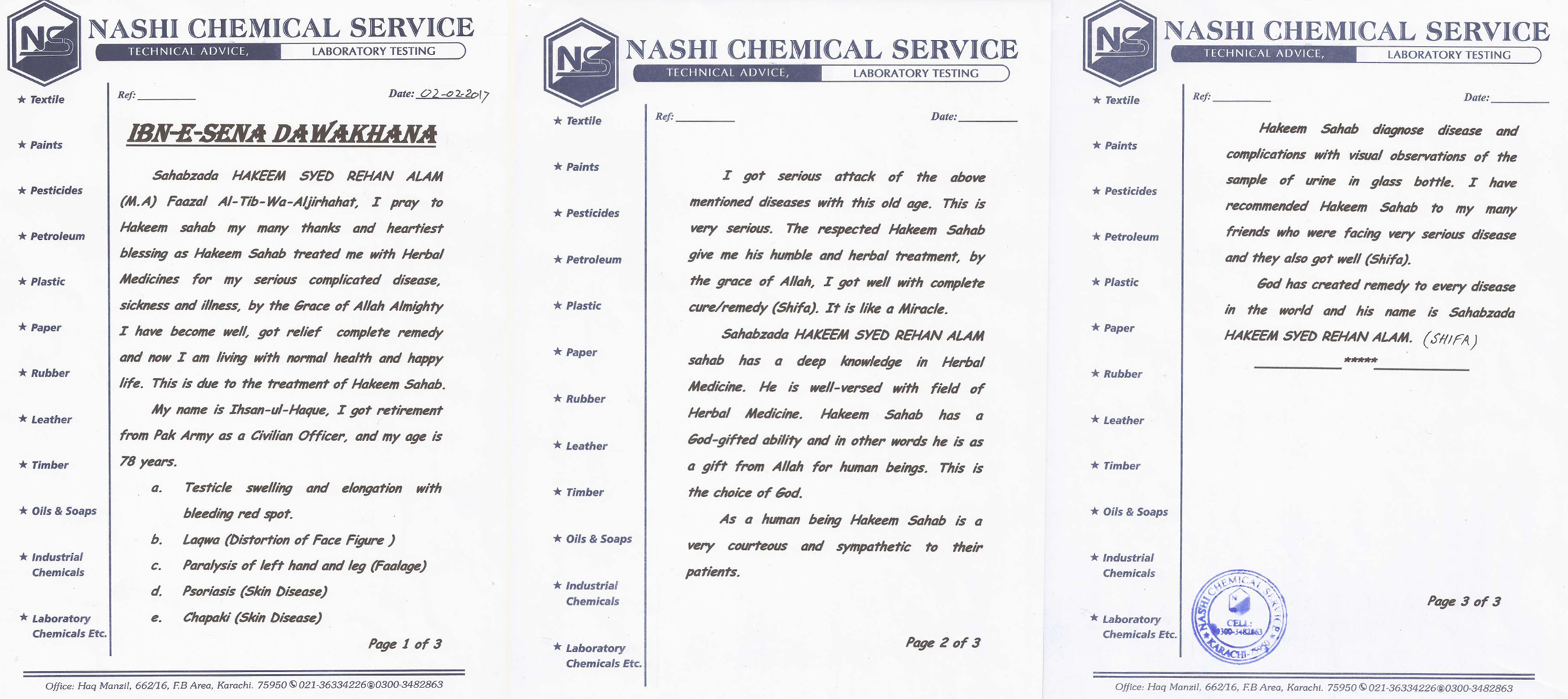 I am back in Karachi and undergoing treatment by Hakeem Syed Rehan Alam. Hakeem Syed Rehan Alam is the third generation. I have known his family since 1957. His grandfather, Late Hakeem Syed Zakir Hussain, was operating his government sponsored clinic in Jehangir Road, Karachi. I did personally witnessed hundreds of patients lining up for his treatment. On his death his older Son Syed Saeed Alam started practicing. On his retirement Hakeem Syed Rehan Alam took over the reins and operating three clinics in Karachi.