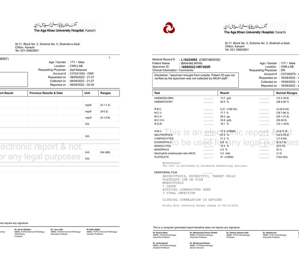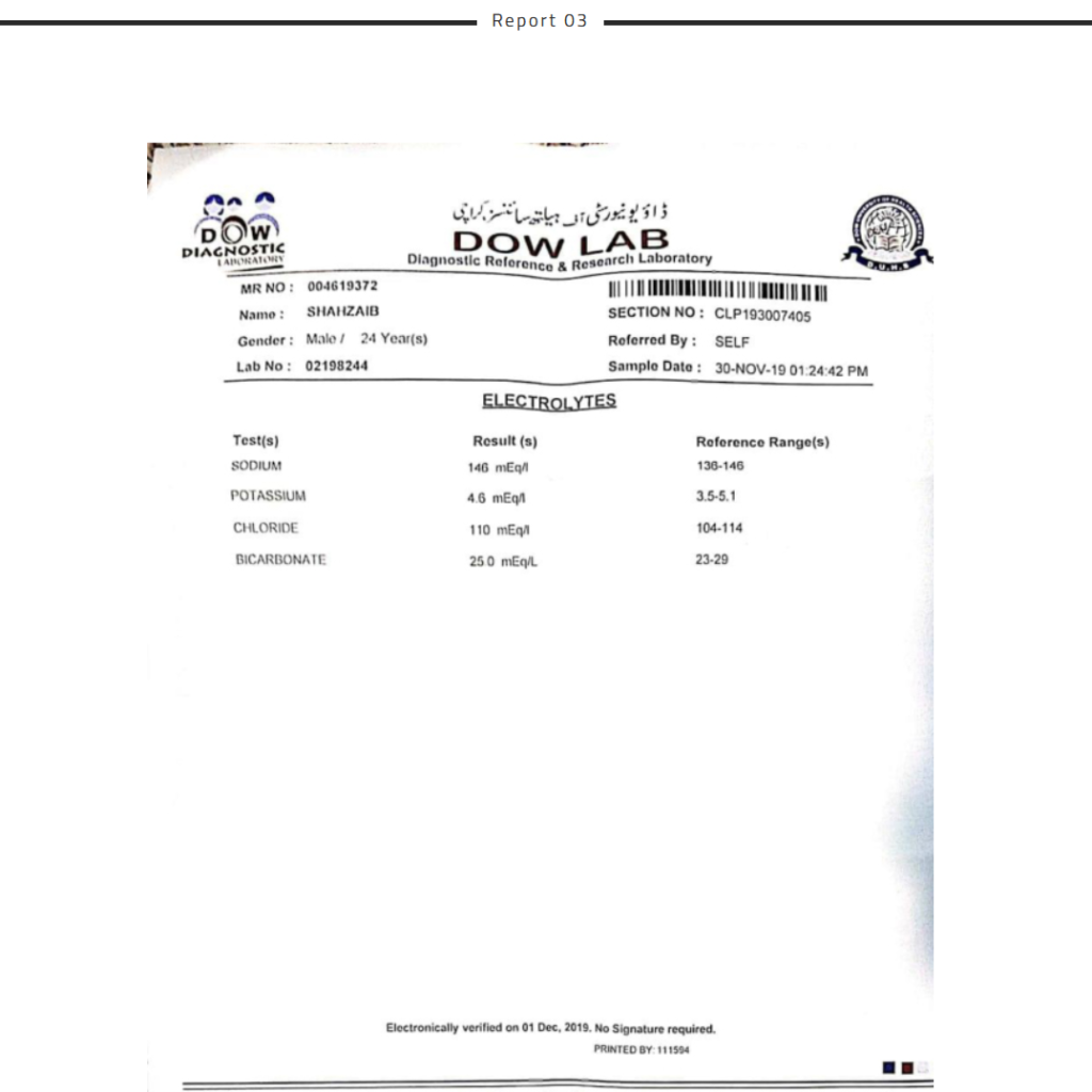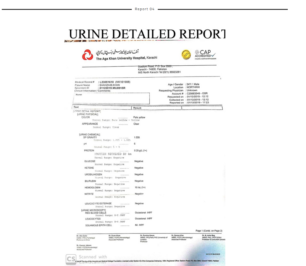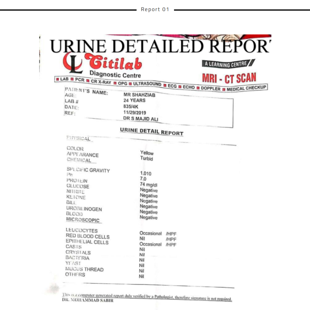 My name is Shahzaib, I am 24-Year-old Finance Executive from Karachi, Today I want to share my experience with all of you. Everything was fine in my life, there was no mishap but in month of December I had a pain on my shoulder so I just went to doctor for regular checkup. He Injected me a Pain killer. Which relief me from pain in just 15 minutes, but after Two days I start feeling Pain in my back. I went to another clinic; He also injected a pain killer without any analysis of cause of pain, After that Injection I started to feel that I would Vomit, and When I reached home , I started Vomiting, Pain killer worked and I got relief from Pain but That was just for Eighteen hours, After that I started to feel pain in my back and Kidney , When I informed Doctor he wrote me Test of Urine DR and also Inject another pain killer for relief, but Pain killer only gave me twelve hours of relief. I got my Test result from Citi Lab during this time.