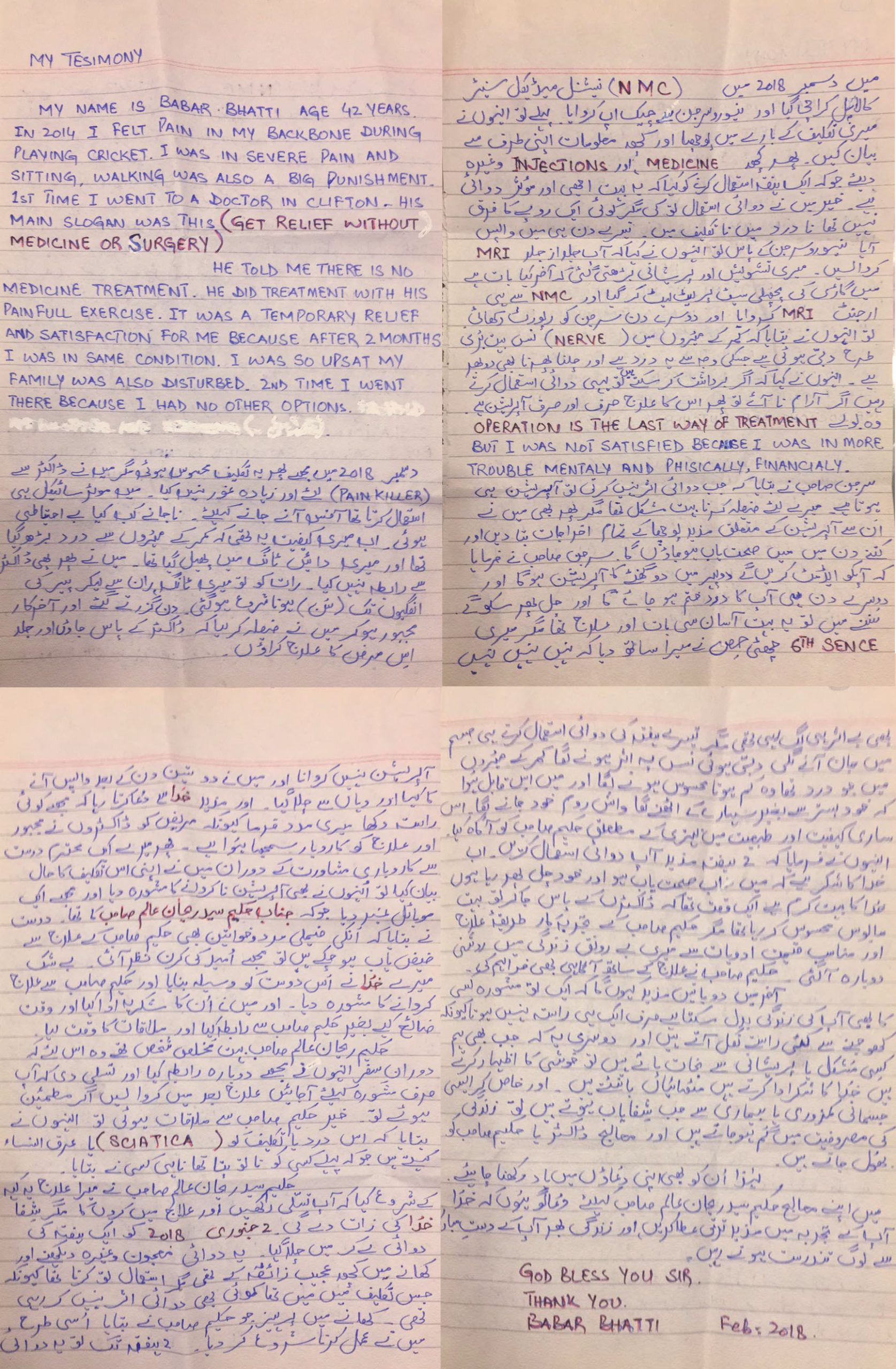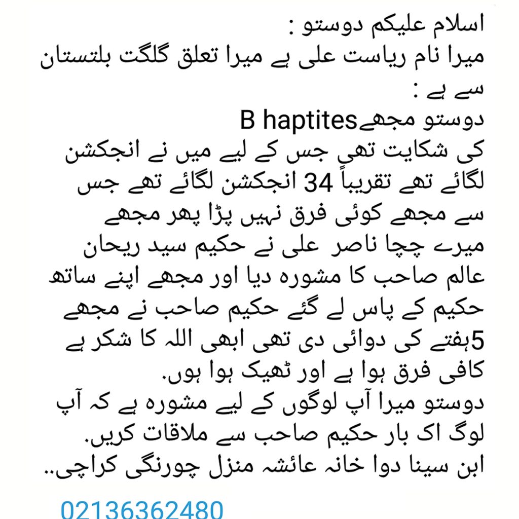 My name is Kashif (personal contact number:03227508809), age 42 years, by occupation I am a building contractor. I visited Dr.Atif Hussain (personal contact no: 03644049604) consultant physical therapist in Doctors Plaza Clifton Karachi Room # 538 for acute disc bulge L4/L5 suspected disc herniation symptoms appeared as Radiculopathy, Dr. Atif Hussain reffered me to visit Ibne Sena Matab and to meet Hakeem Syed Rehan Alam Sb., after some investigation Hakeem Rehan Alam started Course of medicine with a complete bed rest of approx 5 weeks. after completing the course my recovery progress is more than 90%.