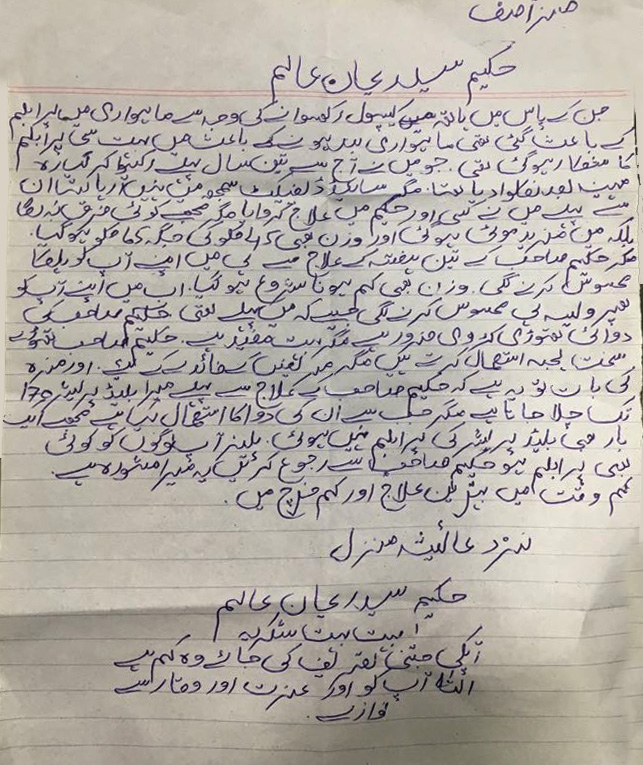 Next day, I was taken to Ibn-e-Sina Dawakhana at Aisha Manzil [Federal B Area, Karachi]. I met with its head, Hakeem Syed Muhammad Saeed Alam, and his son, Hakeem Syed Muhammad Rehan Alam. At that time I was still not able to walk properly. When he [Hakeem Syed Muhammad Saeed Alam] examined my condition, he said that he was giving me a week’s dose of herbal medicines and that inshallah I should be able to walk normally soon. I took the medication for a week, and just as he predicted, I was able to walk normally into his matab for my follow-up. I also felt much more energized than earlier. Hakeem sahab examined me and said that I don’t need any more medicine as I seem to be recovering just fine. I also felt very normal.