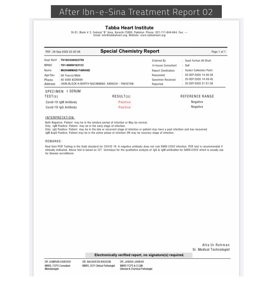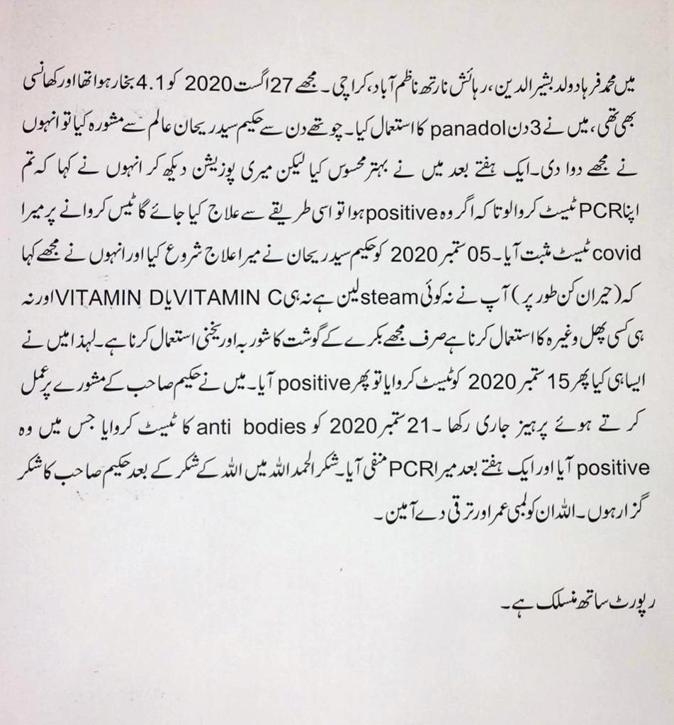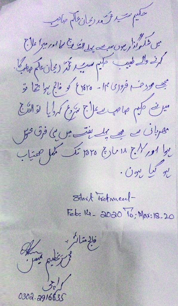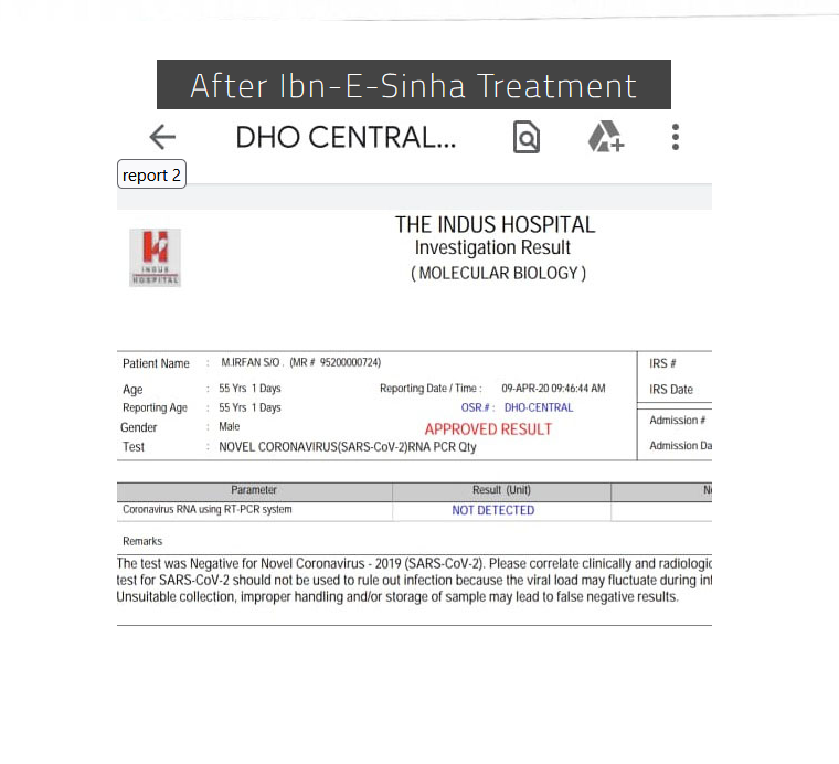 My name is Muhammad Irfan. I am 55 years old. I came back from Dubai to Karachi on 18th March. I am a frequent traveller to Dubai. This time after coming back I got a fever upon which I got myself tested for Corona. My test came out to be positive. The doctors asked me to isolate myself and advised me to take some preventive measures and take steam and recommended consumption of Vitamin C from fruits such as papaya and oranges and they also said that they don’t have any medication for it. After taking steam and eating oranges the condition of my throat worsened. Then one of my friend mentioned and recommended me to consult Hakeem Syed Muhammad Rehan Alam. Upon his recommendation, I talked to Hakeem Syed Muhammad Rehan Alam directly and he advised me after I told him my symptoms and feelings. He asked me to stop intake of any fruits and no need to take Vitamin C because this will further exacerbate my cough and also recommended me to take mutton soup. Then he gave me his medicines and a syrup. After three four days I started to feel much better. The time when I had not taken the medication I was very worried and my condition was worsening day by day but Alhamdulillah after taking the medication I felt much better. I took the medicines for 7 days and after that I got myself tested again and this time I was Corona negative. I informed Hakeem Syed Muhammad Rehan Alam he prescribed me to continue the medication as the medicine course was for two weeks. After 15 days I got tested again and Alhamdulillah it was negative and today I am fine and in good health. Corona virus is not something to be scared of it is a lung disorder Hakeem Syed Muhammad Rehan Alam understood it very well and gave me the medication accordingly and today I am sitting in front of you all healthy and recovered. You should not panic, treatment for corona is available and from my experience I have recovered well and I am here in all health.