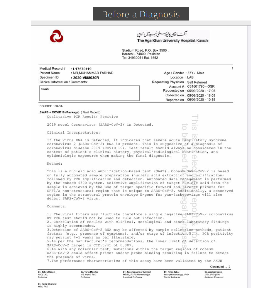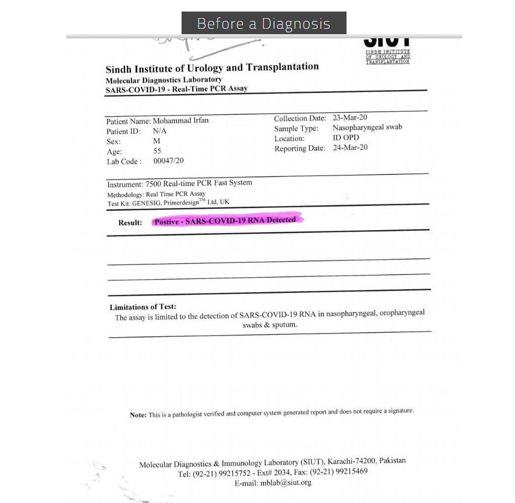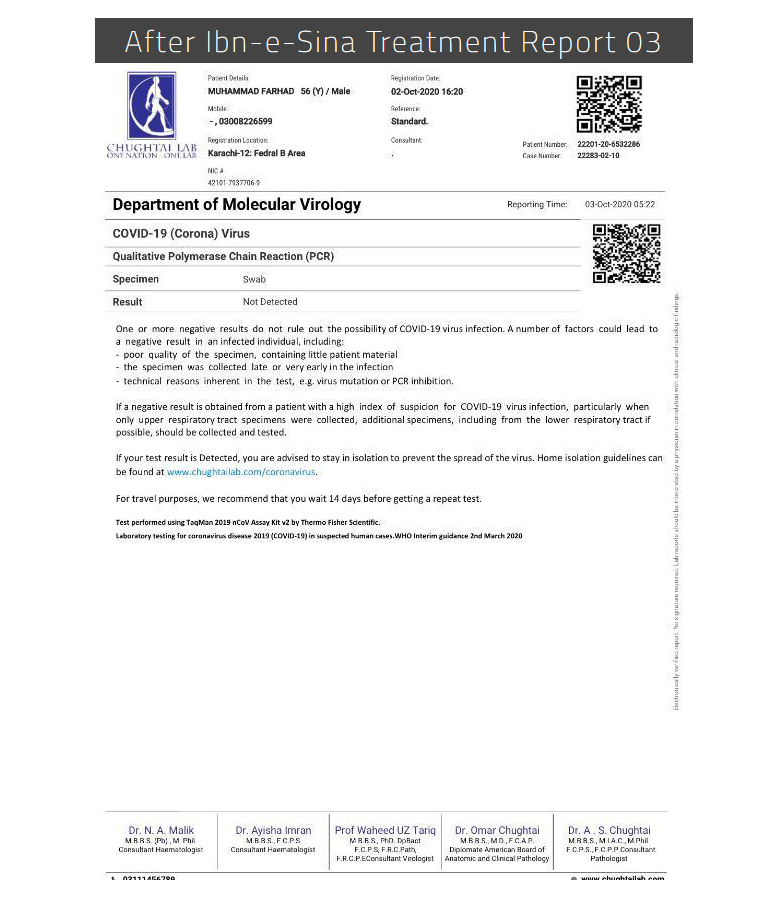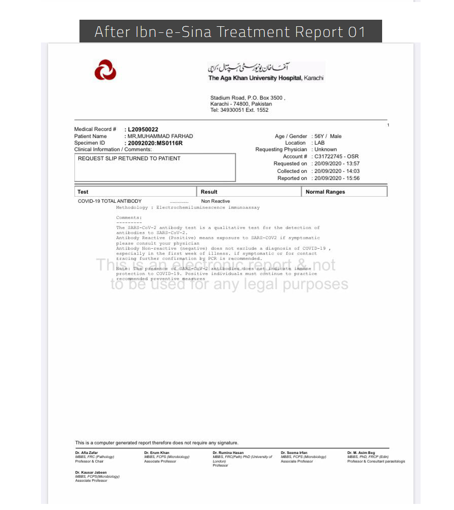 My name is Muhammad Irfan. I am 55 years old. I came back from Dubai to Karachi on 18th March. I am a frequent traveller to Dubai. This time after coming back I got a fever upon which I got myself tested for Corona. My test came out to be positive. The doctors asked me to isolate myself and advised me to take some preventive measures and take steam and recommended consumption of Vitamin C from fruits such as papaya and oranges and they also said that they don’t have any medication for it. After taking steam and eating oranges the condition of my throat worsened. Then one of my friend mentioned and recommended me to consult Hakeem Syed Muhammad Rehan Alam. Upon his recommendation, I talked to Hakeem Syed Muhammad Rehan Alam directly and he advised me after I told him my symptoms and feelings. He asked me to stop intake of any fruits and no need to take Vitamin C because this will further exacerbate my cough and also recommended me to take mutton soup. Then he gave me his medicines and a syrup. After three four days I started to feel much better. The time when I had not taken the medication I was very worried and my condition was worsening day by day but Alhamdulillah after taking the medication I felt much better. I took the medicines for 7 days and after that I got myself tested again and this time I was Corona negative. I informed Hakeem Syed Muhammad Rehan Alam he prescribed me to continue the medication as the medicine course was for two weeks. After 15 days I got tested again and Alhamdulillah it was negative and today I am fine and in good health. Corona virus is not something to be scared of it is a lung disorder Hakeem Syed Muhammad Rehan Alam understood it very well and gave me the medication accordingly and today I am sitting in front of you all healthy and recovered. You should not panic, treatment for corona is available and from my experience I have recovered well and I am here in all health.