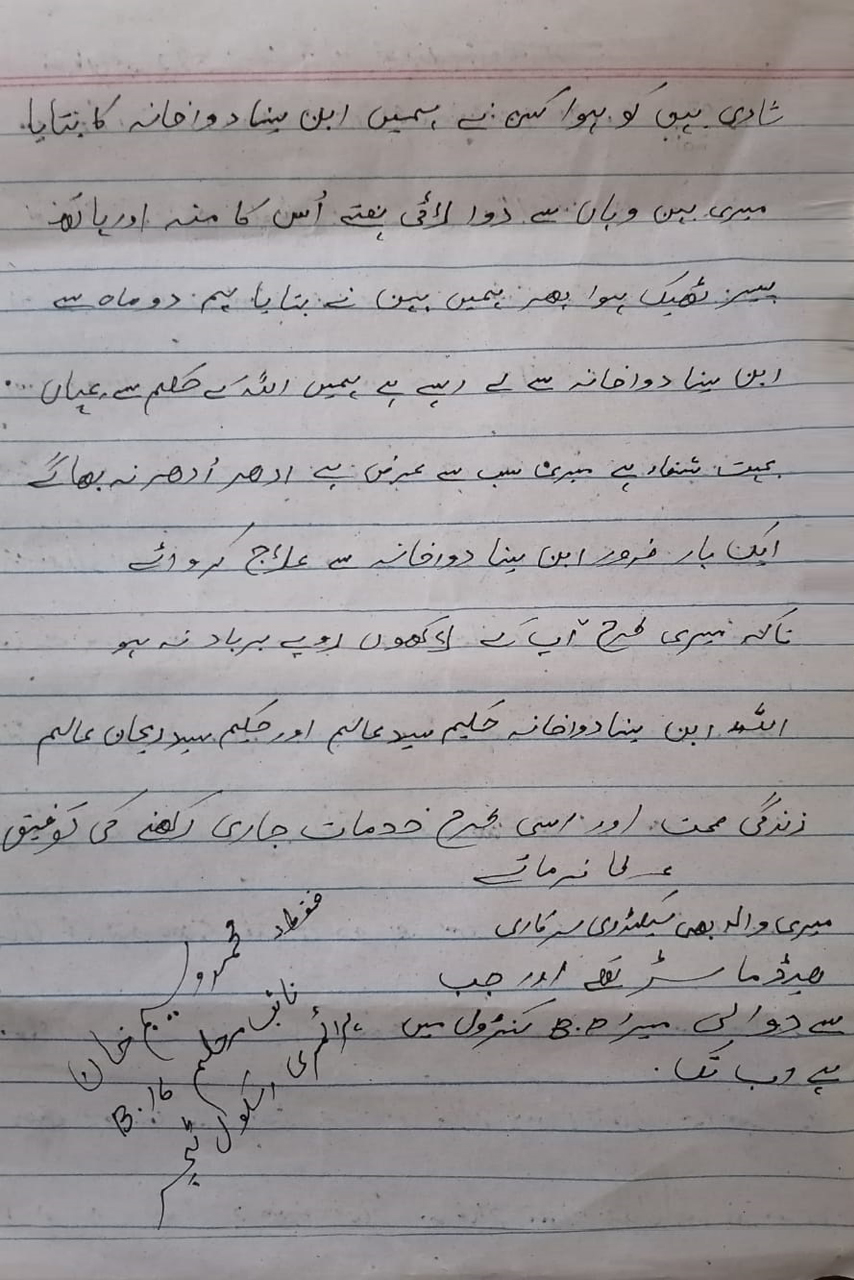 Maine hamesha mazkura atibba ko Unani tarze ilaj men maharat aur ikhlas ka behtreen namuna paya; aur main khuloose dilse duago hoon keh wo in buzurgon ke haqiqi janashin sabit hon.