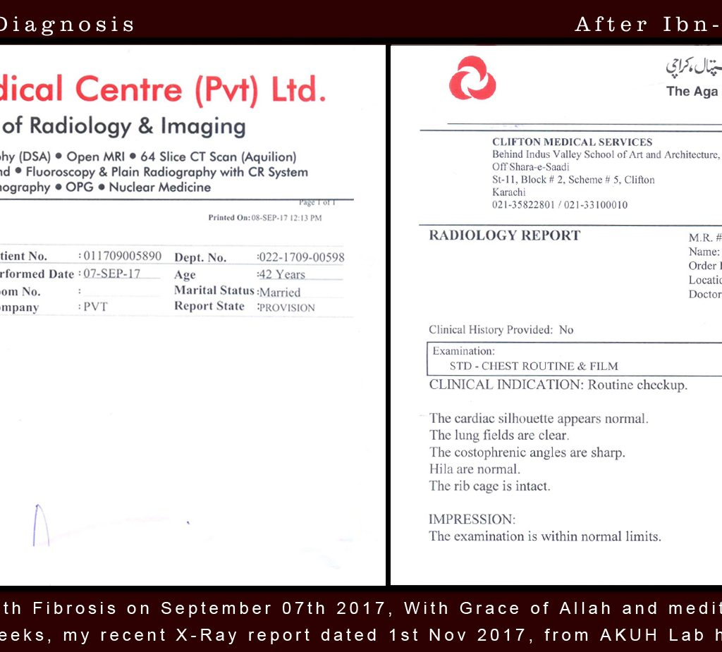 Prior to starting any bombastic medication, in a very depressive mode, I went to consulting Hakeem Sahib. I had trust in his treatment as well as in his intentions. Medicine is given only when he considers necessary and that also for a specifically identified period, which is usually not very long. By the Grace of Allah and with medication and precautions (perhez) advised by Hakeem sb, my recent X-Ray report dated 1st Nov 2017, from a reputed lab has shown NO traces of Fibrosis. My medication is not abruptly discontinued yet, reduced to minimal by Hakeem Sahib.