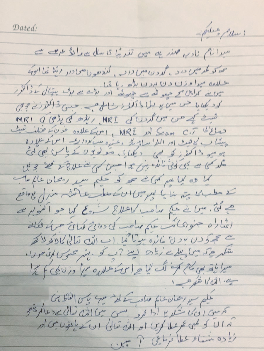 I decided to consult with Hakim Syed Rehan Alam. He advised me that the modern medicines do not have any cure for back problems. He cut my medicines, prescribed and put me on his medications. I followed his advice and used his medicines for three months and my health started improving.