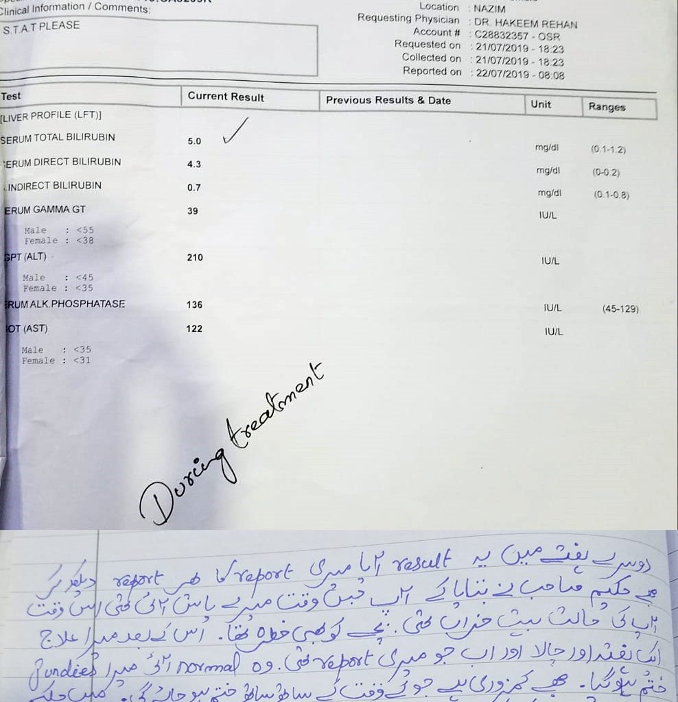 السلام علیکم میرا نام احسن ہے میں سٹوڈنٹ ہوں میری عمر 19 سال ہے رمضان 2018 مجھے ایسا لگتا تھا کہ میری طبیعت کچھ خراب ہے لیکن میں نے اتنا غور نہیں کیا اور میں نے سوچا کہ گرمیوں کی وجہ سے یہ سب ہو رہا ہے روزہ کھولنے کے بعد مجھے متلی محسوس ہوتی تھی تو میں سمجھتا تھا کہ زیادہ تلی ہوئی چیزیں کھانے کی وجہ سے ہو رہا ہے یا گرمی کی وجہ سے، میں نے اپنی صحت پر اتنا دھیان نہیں دیا اور ڈاکٹر سے رجوع نہیں کیا کچھ عرصے بعد ایک پکنک پر گیا اور وہاں سے آنے کے باد میں بیمار پڑ گیا پھر میں نے ڈاکٹر سے رجوع کیا انہوں نے بتایا کہ مجھے پیلیا ہے( Ref : Report 1 & 2 )ڈاکٹر نے مجھے کہا کہ آپ کو کمزوری ہو رہی ہے روز ڈرپ لگوائی ،میں نے تقریبا روز ایک ہفتے تک ڈرپ لگوائی اور میری طبیعت مسلسل خراب ہونے لگی۔پھر میں نے حکیم کا علاج شروع کروایا اور انہوں نے بھی مجھے کہا کہ یہ معمولی پیلیا ہے اتر جائے گا 2 سے 4 ہفتوں میں اور کچھ لوگوں نے مجھے مشورہ دیا کہ دم سے پیلیا جڑوائں میں نے مختلف جگہوں سے دم کروایا لیکن ان سے کچھ خاص فرق نہیں پڑا اور پیلیا بڑھتا جا رہا تھا میری آنکھوں اور جسم سے پیلا پن ظاہر ہو رہا تھا، جسم پر خارش ہونے لگ گئی تھی اور اس کی وجہ سے مجھے نیند نہیں آتی تھی،دن میں صرف دو سے چار گھنٹے سوتا تھا ،کافی خراب حالت ہو گئی تھی کمزوری کی وجہ سے زیادہ چلا پھرا نہیں جاتا تھا . پھر میں نے دوسرے حکیم سے رجوع کیا تو جب میرا پیلیا (Ref: Report 3&4, – 28 bilirubin ) تھا جو کہ میری صحت کے لیے خطرے کا باعث تھا ،وہاں سے ایک ہفتے علاج کروانے کے بعد میری طبیعت میں کچھ بہتری آنے لگی۔ انہوں نے مجھے مشورہ دیا کہ آپ حکیم ریحان کے پاس جائیں۔میں نے حکیم ریحان سے رجوع کیا انہوں نے مجھے دیکھ کر کہا کے آپ کا پیلیا بہت بڑھا ہوا ہے ۔جب میں ان کے پاس آیا تو میرا پیلیا (.18 .Bilirubin total ) تھا اور انہوں نے اپنے طریقے اعلاج سے مجھے پرہیز بتایا اور وہ ہر ہفتے میرا صبح کا پہلا قارورہ (پیشاب) دیکھتے تھے جو کہ ان کے طریقہ علاج میں شامل ہے ،بیس سے پچیس دنوں بعد حکیم صاحب نے ہفتہ وار میرے (LFT) ٹیسٹ کروانا شروع کر دیے جو کہ ہماری تسلی کے لئے کروائے گئے تھے ورنہ ان کا علاج (پیشاب) قارلورہ کو دیکھ کر تجویز کرنے کا ہے اور میری (LFT) کی رپورٹس نیچے مندرجہ ذیل ہیں جو کہ واضح بتا رہی ہیں کہ میرے پیلیا میں ہر ہفتے بہتری ای اور انہوں نے مجھے سخت پرہیز بتایا اور سختی سے عمل کرنے کا کہا میں نے وہ پرہیز سختی سے عمل کیا تقریبا ڈھائی مہینے،اور ان کے علاج اور اللہ کے فضل و کرم کی وجہ سے میری طبیعت میں بہتری آنے لگی،میرے علاج کو ختم ہوئے وے دو مہینے ہو چکے ہیں اور الحمدللہ میں صحتیاب ہو اور تقریبا ہر چیز کھا سکتا ہوں پراٹھا گھی چکنائی تیل وغیرہ مگر کچھ چیزوں سے ابھی بھی پرہیز ہے جیسے انڈا مچھلی اور گائے کا گوشت یہ کچھ عرصے تک منع ہے ان کے علاج کے ڈھائی مہینے بعد میرے (LFT) ٹیسٹ چل رہے ہیں تاکہ جو تھوڑا سا پیلیا باقی ہے اسے بھی مکمل طور پر ختم کرسکیں۔ یہ بہت بڑھا ہوا تھا اس وجہ سے اسے بہت وقت لگا ٹھیک ہونے میں اور اس کی بڑھنے کی وجہ بدپرہیزی اور زیادہ مقدار میں دوائیوں کا استعمال ہے اور یہ پیلیا مجھے پانچ مہینے تک رہا ،جس میں ڈھائی مہینہ مختلف جگہوں سے علاج کروایا اور ڈھائی مہینہ حکیم ریحان سے علاج کروایا اور اللہ کے فضل و کرم سے مجھے شفا ملی ۔اور پھر اس سے مجھے ایک بات سیکھنے کو ملی کے مشورے تو بہت لوگ دیتے ہیں لیکن ضروری نہیں ہے ہم ہر کسی کے مشورے پر عمل کریں اچھے بندے سے مشورہ لیں اور جب تک کسی ڈاکٹر سے مطمئن نہیں ہوتے اس سے اپنا علاج نہیں کروایں۔ میں نے تین جگہوں سے علاج کروایا اور جب چوتھی جگہ حکیم ریحان کے پاس گیا وہاں سے الحمدللہ مجھے شفا ملی۔